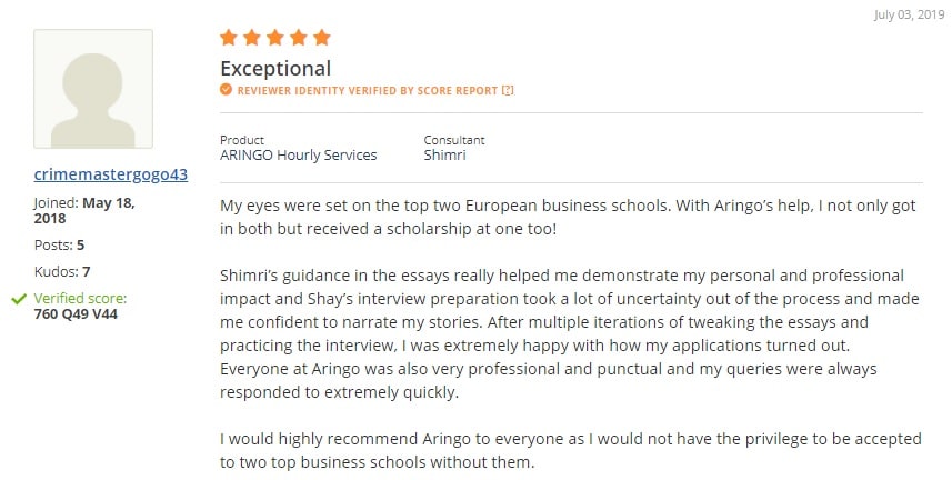 Gmatclub review for ARINGO MBA ADMISSION CONSULTING